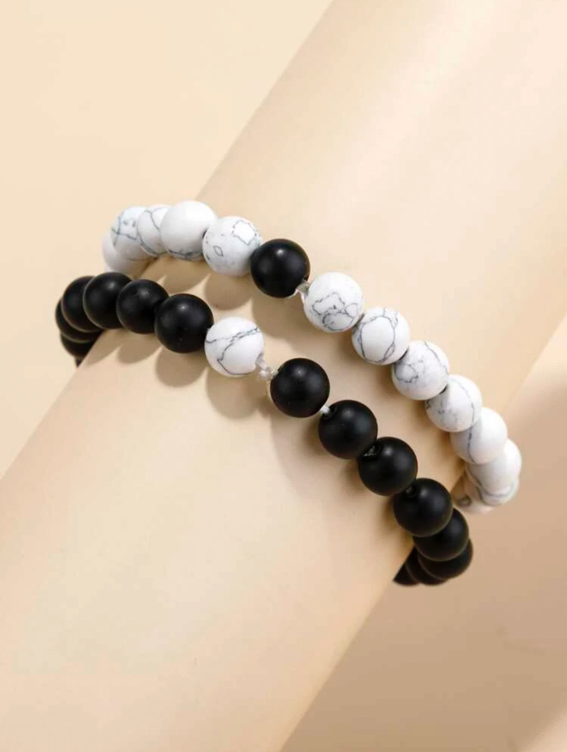 Dodaj do swojej kolekcji biżuterii nutę elegancji i symboliki dzięki zestawowi dwóch bransoletek wykonanych z naturalnego howlitu oraz czarnych, matowych koralików. Kontrast pomiędzy bielą kamienia z delikatnym użyłkowaniem a głęboką czernią nadaje całości wyrazistości i pozwala tworzyć niebanalne stylizacje.